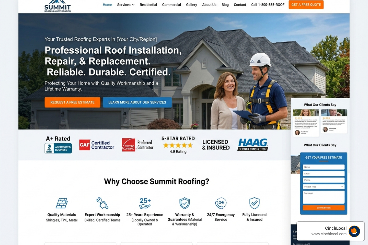 - Click-to-Call: Most roofing searches happen on mobile. Make the phone number a giant, clickable button at the top of the page.