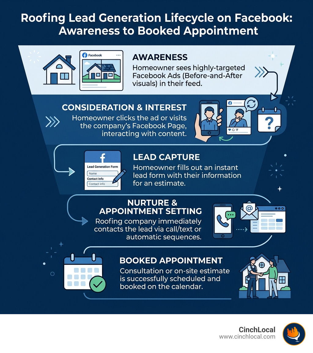 A "leaky" funnel is the number one reason roofing contractors lose money on Facebook. You cannot simply point an ad at your homepage and hope for the best. To succeed, you need a structured path that takes a stranger and turns them into a booked inspection.