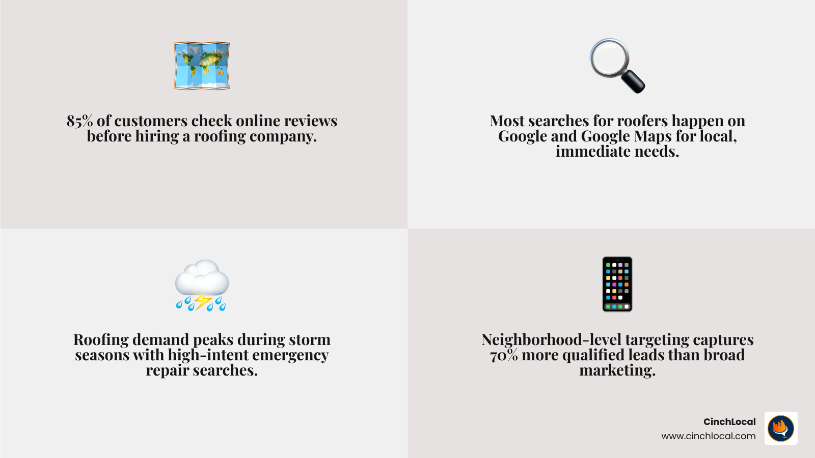 At CinchLocal, we don't just "do marketing." We implement our "Roofer Footprint Expansion System" to guarantee increased visibility and pre-sold leads. Whether you are looking to dominate Google Maps or build a website that actually converts, we are here to help you scale. Ready to take your roofing business to the next level? Contact CinchLocal today for a tailored consultation and let’s build your empire together.