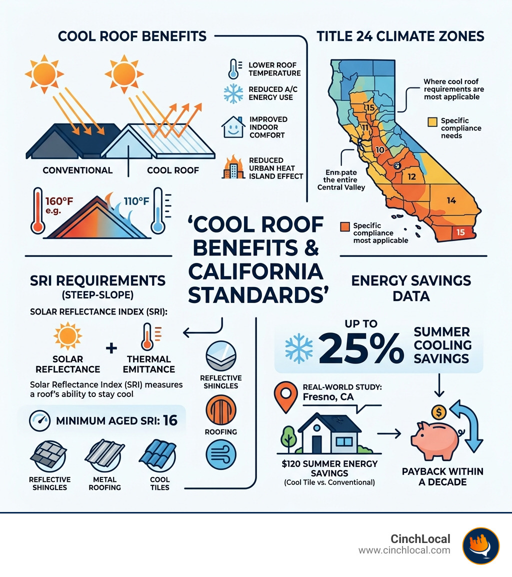 - Solar Integration: California now requires solar panels on most new construction. Cool roofs are the perfect partner for solar because they reduce the ambient temperature around the panels, which can actually improve the PV system's efficiency.