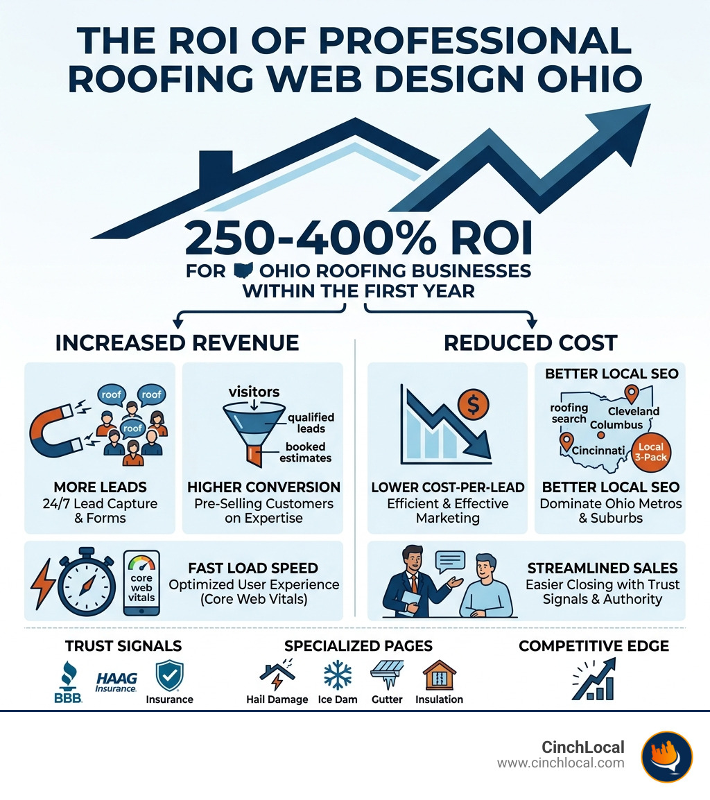- A professionally designed roofing website in Ohio can deliver a 250–400% return on investment in the first year